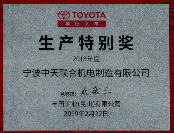 中天聯(lián)合機電喜獲豐田工業(yè)(昆山)有限公司2018年度生產(chǎn)特別獎